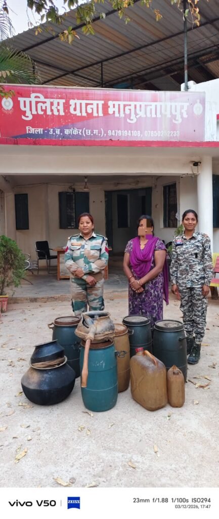 इसी क्रम में दिनांक 12.03.2026 को थाना भानुप्रतापपुर पुलिस को मुखबिर से सूचना प्राप्त हुई कि डॉली कोर्राम द्वारा अपने घर के पीछे बाड़ी में अवैध रूप से देशी महुआ शराब बिक्री हेतु रखी गई है। सूचना पर पुलिस टीम द्वारा मौके पर पहुंचकर घेराबंदी की गई।