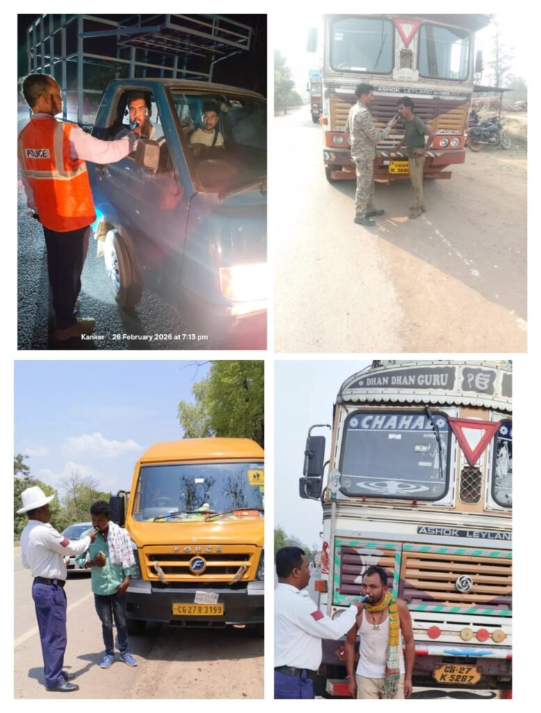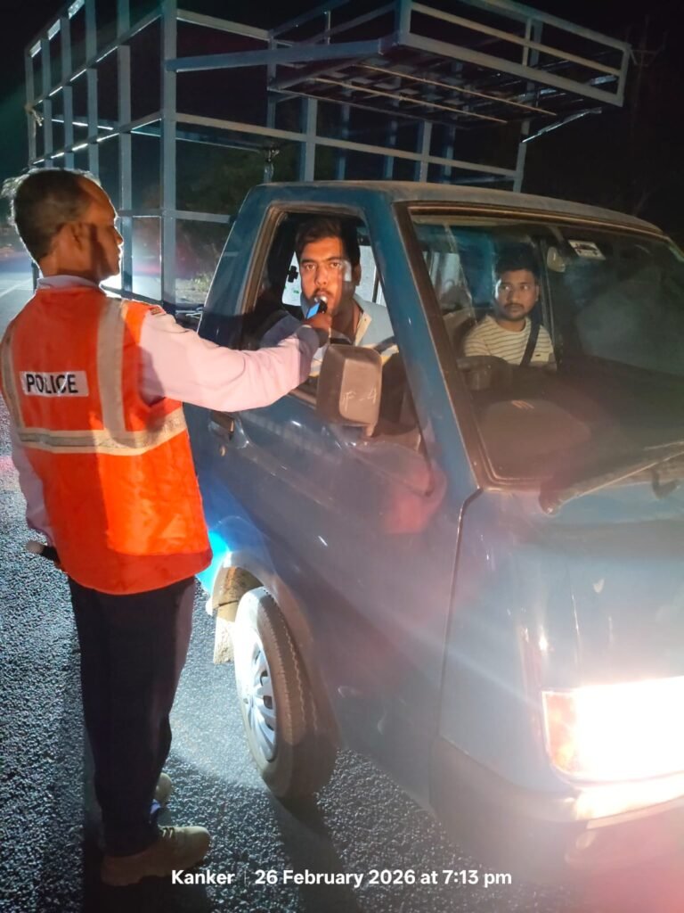 सड़क दुर्घटनाओं में कमी लाने हेतु ड्रिंक एण्ड ड्राइव के विरुद्ध सख्त कार्यवाही102 प्रकरणों में कार्यवाही व ₹8,20,900 का अर्थदंड। 100 से अधिक वाहनों को किया गया जब्त।नाबालिग वाहन चालकों पर विशेष निगरानी।बढ़ते सड़क हादसों को गंभीरता से लेते हुए थाना/चौकी एवं यातायात पुलिस द्वारा “ड्रिंक एण्ड ड्राइव” (धारा 185 मोटरयान अधिनियम) के अंतर्गत निरंतर सघन चेकिंग अभियान संचालित।पुलिस अधीक्षक निखिल राखेचा (भापुसे) के निर्देशन में ,डॉ. मेखलेन्द्र प्रताप सिंह, डीएसपी (बस्तर फाइटर्स)के पर्यवेक्षण में तथा RI दीपक साव जिला कांकेर पुलिस द्वारा माह फरवरी 2026 में सड़क दुर्घटनाओं में कमी लाने के उद्देश्य से विशेष अभियान चलाया गया। माह फरवरी के दौरान जिले के विभिन्न स्थानों पर नियमित चेक पोस्ट स्थापित कर शराब पीकर वाहन चलाने वाले चालकों के विरुद्ध कठोर कार्यवाही की गई। कुल 102 वाहनों/चालकों पर ड्रिंक एण्ड ड्राइव के तहत प्रकरण दर्ज किए गए।माननीय न्यायालय द्वारा कुल ₹8,20,900/- (आठ लाख बीस हजार नौ सौ रुपये) का अर्थदंड अधिरोपित किया गया।प्रति चालक औसतन ₹10,000 से ₹15,000 तक का जुर्माना लगाया गया।नाबालिग वाहन चालकों पर विशेष निगरानी रखते हुए यह पाया गया कि नाबालिग वाहन चालक यातायात नियमों से अनभिज्ञ होने के कारण दुर्घटनाओं की आशंका अधिक रहती है। इस संबंध में यातायात पुलिस द्वारा नाबालिग चालकों के विरुद्ध आवश्यक वैधानिक कार्रवाई की जा रही है। उनके अभिभावकों को बुलाकर समझाइश दी जा रही है। यातायात सुरक्षा नियमों के प्रति जागरूकता बढ़ाने हेतु मार्गदर्शन प्रदान किया जा रहा है।थाना/चौकी एवं यातायात पुलिस द्वारा निम्न प्रकार के उल्लंघनों पर भी सतत चालानी कार्यवाही की जा रही हैं तेज गति से वाहन चलाना स्टंटबाजी करनामालवाहक वाहनों में सवारी ढोना बिना हेलमेट/सीट बेल्ट वाहन चलाना तीन सवारी चलाना लापरवाहीपूर्वक एवं नशे की अवस्था में वाहन संचालन।इस सतत कार्यवाही के परिणामस्वरूप जिले में लगातार हो रही सड़क दुर्घटनाओं में उल्लेखनीय कमी दर्ज की गई है।इन कार्यवाहियों का मुख्य उद्देश्य आम नागरिकों के जीवन की सुरक्षा सुनिश्चित करना एवं सड़क दुर्घटनाओं में प्रभावी कमी लाना है।कांकेर पुलिस की अपील: नशे की हालत में वाहन न चलाएं।दोपहिया वाहन चलाते समय हेलमेट अवश्य पहनें।चारपहिया वाहन में सीट बेल्ट का उपयोग करें।तीन सवारी एवं स्टंटबाजी से बचें। निर्धारित गति सीमा का पालन करें।आपकी सावधानी ही आपके परिवार की सुरक्षा है।जिला पुलिस कांकेर सड़क सुरक्षा, जन-जागरूकता एवं कानून व्यवस्था बनाए रखने हेतु सतत प्रयासरत है तथा आम नागरिकों की सुरक्षा के लिए प्रतिबद्ध है।