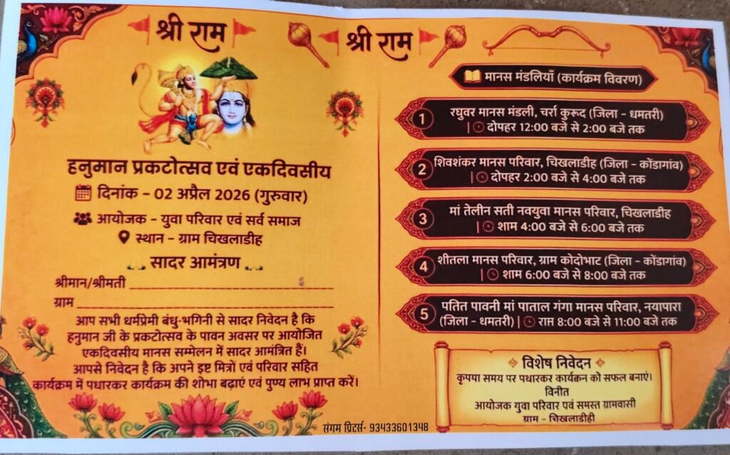 केशकाल – केशकाल नगर पंचायत से सटे ग्राम पंचायत गौरगांव के आश्रित ग्राम चिखलाडिही में हनुमान जन्मोत्सव के उत्सव पर कार्यक्रम किशुरुआत कलश शोभा यात्रा के साथ शुरुआत किया गया । उसके पश्चात हवन पूजन कर हनुमान चालीसा का पाठ किया गया मानस मंडलियों के द्वारा सुन्दर पाठ किया गया मानस मंडली रघुवर मंडली कुरुद जिला धमतरी शिवशंकर मानस परिवार कोदोभाट पतित पावनी मां पाताल गंगा परिवार नयापारा धमतरी के द्वारा मानसगान पाठ किया गया